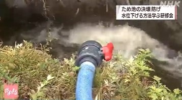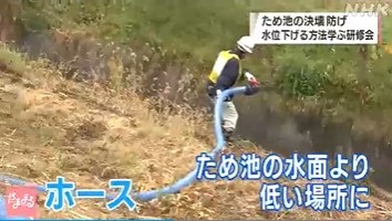 このあと、担当者が長さ10メートル、太さ7.5センチのホース3本をつなげて、ため池から水を抜くための装置を作り、ホースをため池の中から堤防を経由して水面よりも低い場所まで設置しました。