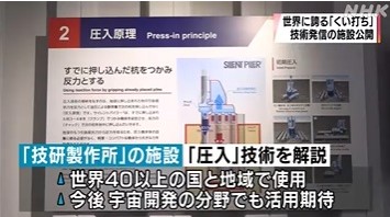 今回開設した施設では、この「圧入」の技術についてパネルや映像でわかりやすく解説されていて、「圧入」の技術が、世界の40以上の国と地域で使用され、今後は宇宙開発の分野でも活用が期待されることなどが紹介されています。