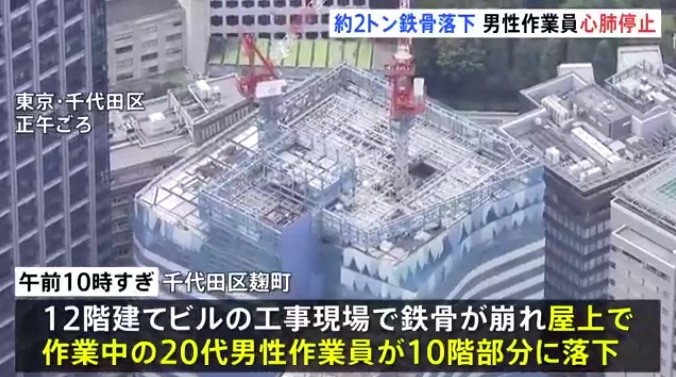 30日午前10時すぎ、東京都千代田区麹町の建設工事現場で、20代の男性作業員が約9メートル落下する事故があった。
