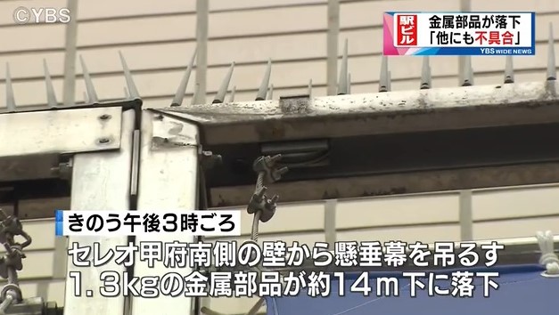 JR甲府駅ビル「セレオ甲府」によると、19日午後3時ごろ、建物の南側の壁に懸垂幕を吊るすために取り付けられていた重さ1.3キロの金属製の部品が、約14m下の歩道に落下した。
