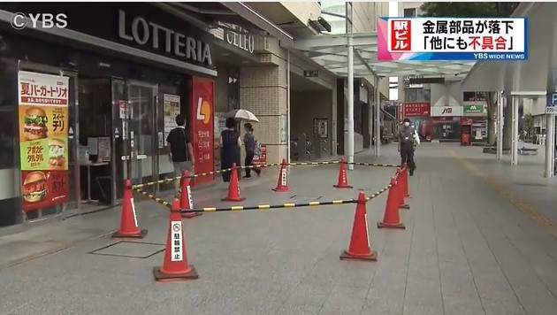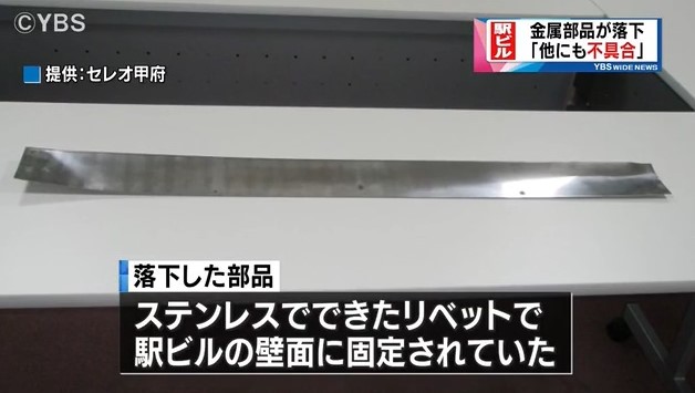 19日午後、JR甲府駅の駅ビルの壁面から懸垂幕を吊るす金属製の部品が外れ、約14メートル下に落下した。