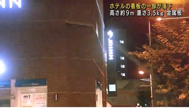 約9メートルの高さから落下したのは、縦70cm、横30cm、重さが3.5kgある金属の板で、ホテルの外壁に取り付けられた看板の上部の「フタ」にあたる部品です。