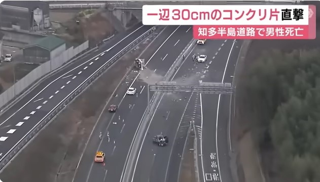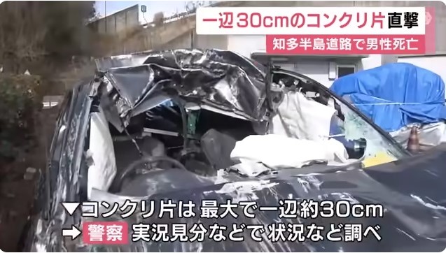 愛知県半田市の知多半島道路で10日、対向車線のダンプカーの積み荷が直撃し、乗用車の運転手が死亡した事故で、直撃したコンクリート片は1辺30センチほどだったことがわかりました。