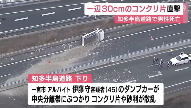 10日午後4時半ごろ、半田市深谷町の知多半島道路の下りで、一宮市のアルバイト・伊藤容疑者(男性、45歳)が運転するダンプカーが中央分離帯にぶつかり、積み荷のコンクリ片や砂利が上り車線まで散乱しました。