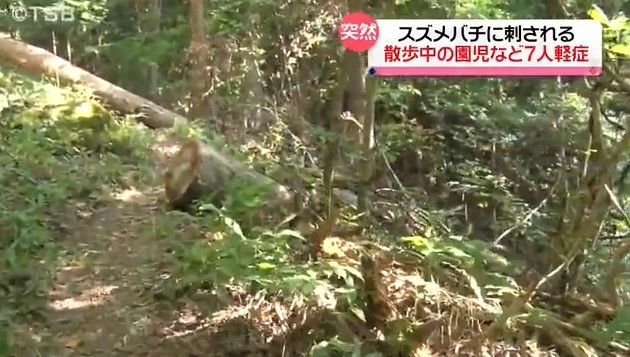 5日午前9時55分頃、長野県松本市浅間温泉の大音寺山にある遊歩道で、「N保育園」(同市浅間温泉)の4~5歳の園児6人と引率していた40歳代の男性保育士1人の計7人がオオスズメバチに腕や足などを刺された。