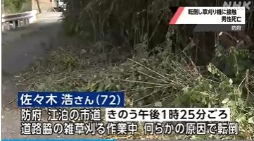 山口県警防府警察署は16日、山口県防府市江泊で除草などの作業をしていた宇部市に住む防府市職員の男性(72)が除草作業中に草刈り機に接触し死亡したと発表しました。