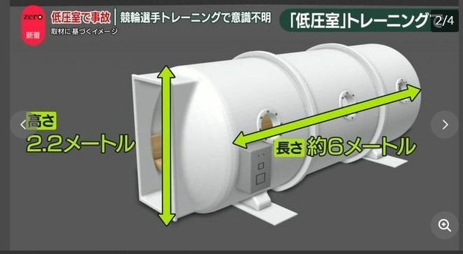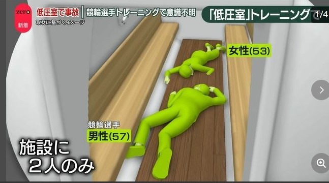 救急隊がかけつけると、そこには長さ約6メートル、高さ2.2メートルの「低圧室」があり、その中で、“低気圧トレーニング”を行っていた競輪選手の男性(57)と、操作していた女性(53)が、意識を失った状態で倒れていたということです。